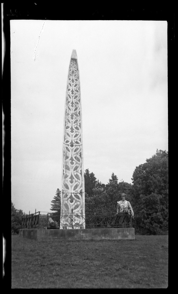 By January 1923, the waka had been installed at the far end of Virginia Lake/Rotokawau, on the former site of Toronui pā, as a memorial to Pura. It was described as ‘a very old and fine Maori canoe erected on its end, and painted in true Maori style, and is visible from all parts of the lake’. The memorial was surrounded by an iron fence, and there was a plaque at the base stating that the tiki had been erected to the memory of Pura McGregor.